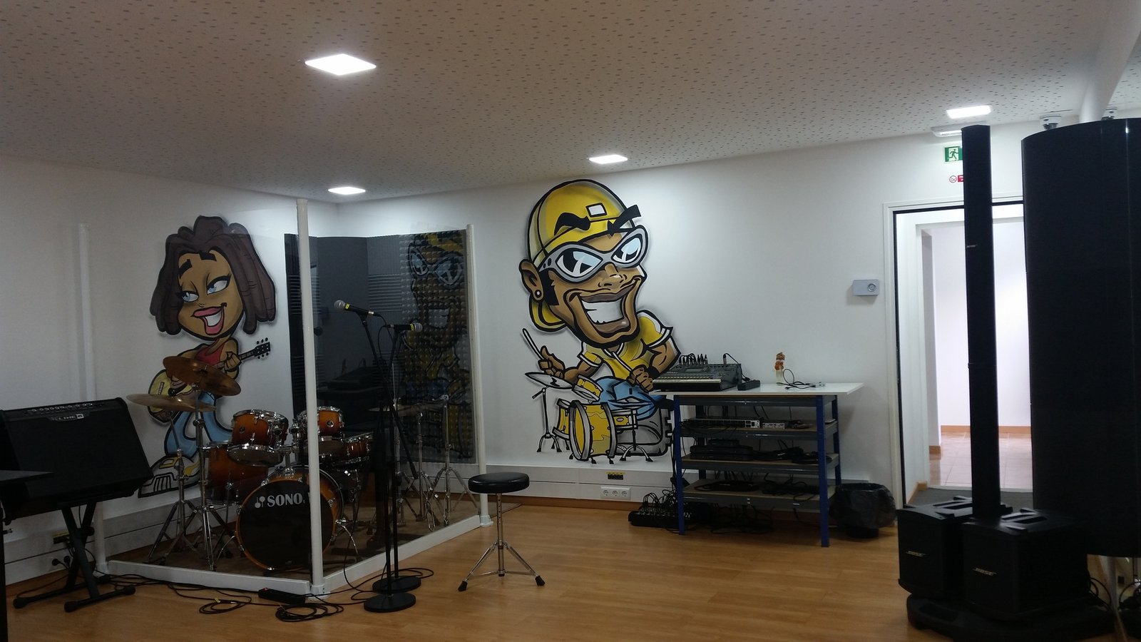 . Sala de ensaios com sistema de som e bateria;